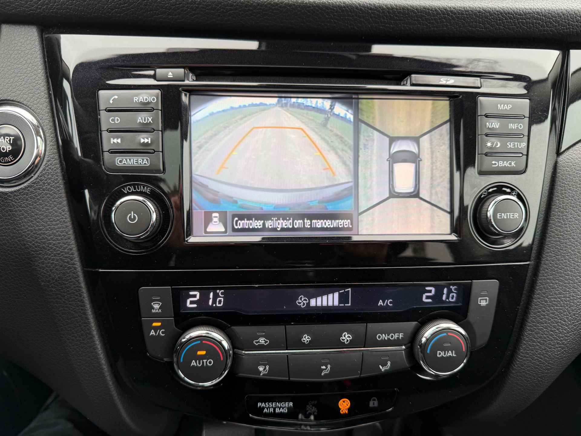 De functie van deze 360 graden camera is vooral nuttig in smalle straatjes waar het zicht beperkt is. Nooit meer te warm of te koud. De automatische airconditioning zorgt altijd voor de temperatuur die u kiest. Parkeersensoren zijn een handig hulpmiddel om parkeerschades te voorkomen. Nooit te snel, altijd constant: dat is het voordeel van de aanwezige cruise control. Het onhandige gevoel van eerst graven naar de autosleutels om in te kunnen stappen is voorbij dankzij de keyless entry. Ook is de Nissan uitgerust met: navigatiesysteem, DAB ontvangst en automatisch dimmende binnenspiegel.